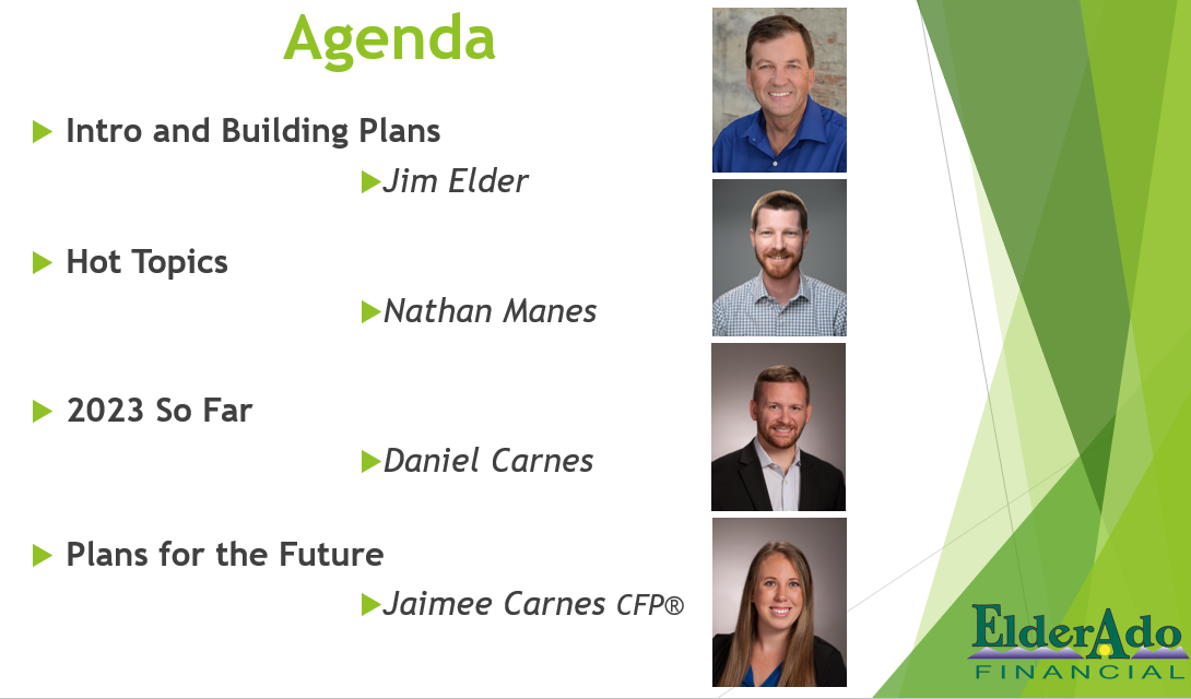 Tune in to our fall seminar to hear about ElderAdo's building plans, 2023 So Far, and Plans for the Future. We will also be diving into hot topics such as artificial intelligence, government spending, inflation, interest rates, digital currency, Charles Schwab merger, bank failures, volatility, ...